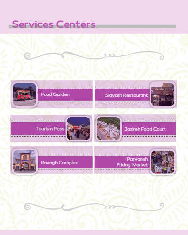 Services Centers Food Garden Siavash Restaurant Tourism Pass Jazireh Food Court Parvaneh Ravagh Complex Friday Market